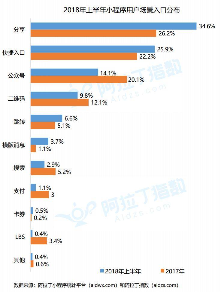 根据阿拉丁《2018上半年小程序生态白皮书》,小程序访问场景频次的前三位分别是群聊、最近使用的小程序、App分享消息卡片。而带有一点小程序流量入口意味的搜索行为,仅仅处于第五位(发现栏目小程序主入口搜索结果)和第十九位(微信主搜索栏结果)。具体的综合数据如下,搜索位于第七: