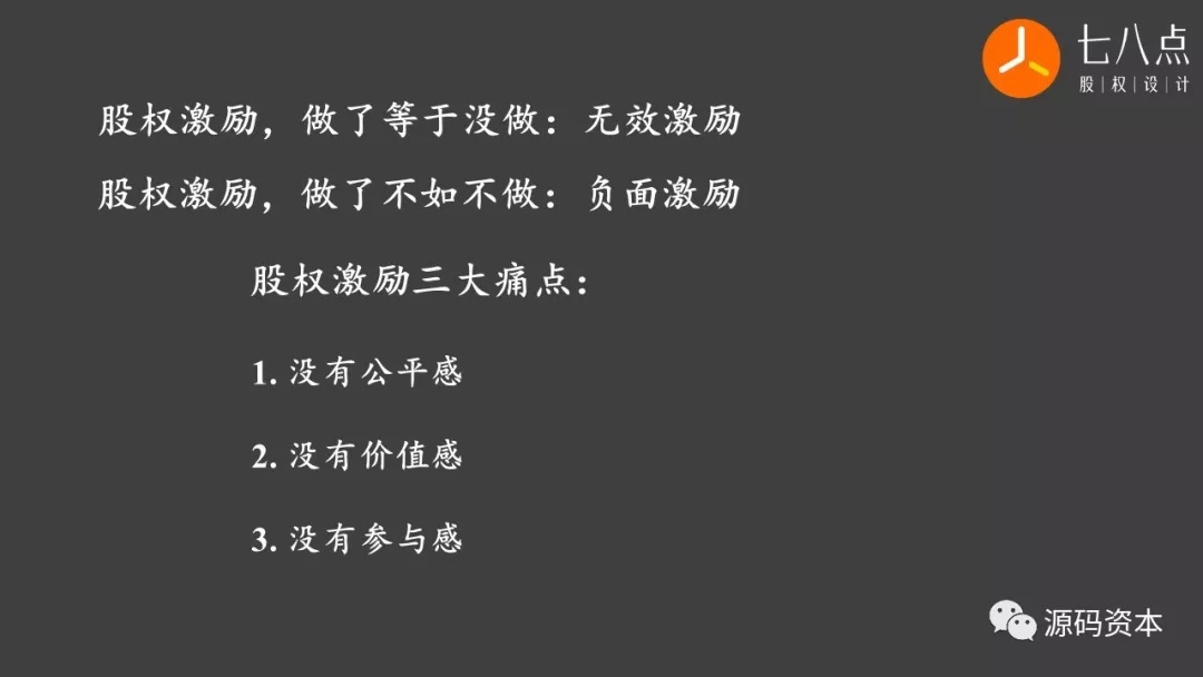 第三个观点,很多公司虽然也做了股权激励,但要么做了等于没做,是无效激励。要么做了不如不做,是负面激励。我听到过很多创业者与被激励的高管员工反馈,公司做完股权激励之后,员工发现“三大没变化”:一是“身份没变化”,过去是员工现在也没感觉自己是股东或合伙人;二是“权利没变化”,原来不知道的事现在还是不知道,原来不参与讨论的事现在还是没法参与讨论,过去不分钱现在还是不分钱;三是“责任没变化”,公司发期权,员工反正就没掏过钱,除了遥遥无期不可预测的上市敲钟那3秒钟可能会兴奋一下,上市前八年十年感觉公司和Ta啥毛线关系都没有。为什么会这样?我们认为大部分公司的股权激励有三大痛点:一是没有公平感,二是没有价值感,三是没有参与感。