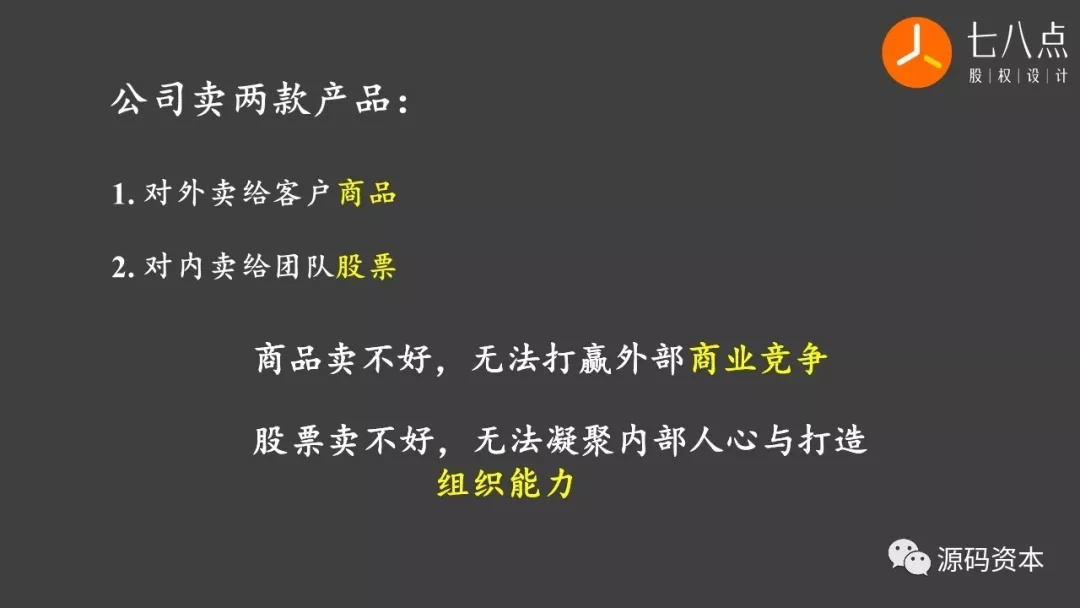 第一个观点,公司都在卖两款产品,一款是卖给外部客户的商品,一款是卖给内部团队的股票。商品卖不好,公司现金流会枯竭,很难打赢外部商业竞争。股票卖不好,很难凝聚内部人心,很难构建真正的组织能力,尤其是我们身处的知识经济时代,合伙共创共享型组织已经越来越成了现代商业组织的标配。