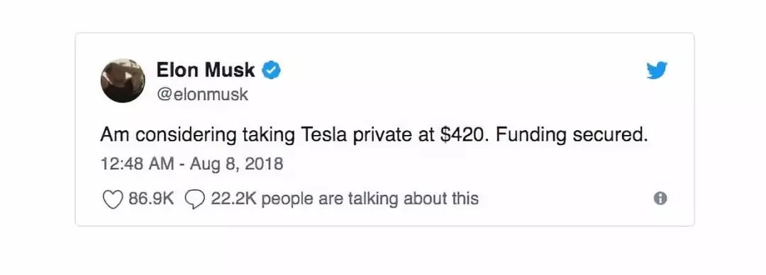 当天早上,马斯克和女友、音乐家格兰姆斯(Grimes)在家中醒来,然后晨练。随后,他驾驶着特斯拉Model S赶往机场。在去机场的路上,马斯克发布了考虑将特斯拉私有化的重大消息。
