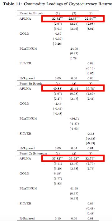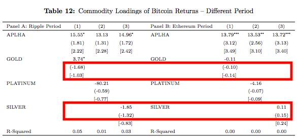 在此基础上,研究还针对瑞波币和以太坊,对比比特币收益在较短时间内的大宗商品敞口。在瑞波币的这段期间,比特币收益与黄金、铂呈负相关性,且与以太坊类似;在以太坊期间,比特币收益与银呈负相关性,与瑞波币相反。因此,加密货币价格与大宗商品不存在相关性。