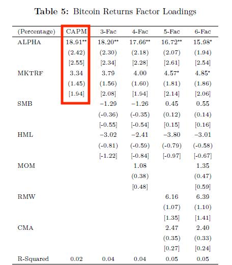 为了确定加密货币与股票之间的相关性,Aleh 引入股票收益率分析模型 CAPM-Fama。该模型是基于资本资产定价模型(CAPM)模型发展而来,即认为资产的预期收益率与衡量该资产风险的尺度 β 值之间存在正相关关系。
