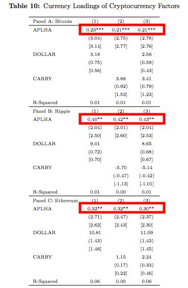 基于 Lustig, Roussanov 和 Verdelhan 等人对于“货币市场的常见风险因素”的研究,Aleh 进一步测试这三种加密货币的风险敞口,与之前研究特定法定货币的结果一致。