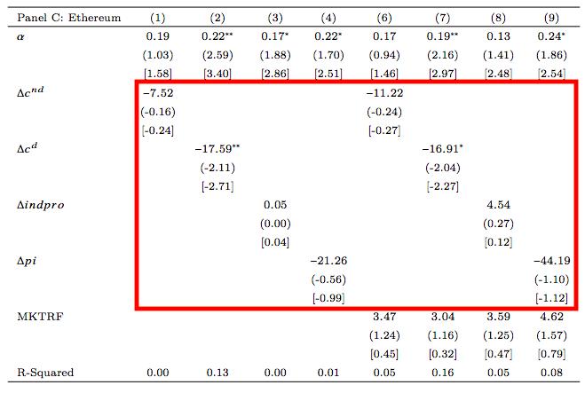 在宏观经济因素方面,研究选取非持续性消费增长、持续性消费增长、工业生产增长以及个人收入增长作为研究角度。对于比特币及瑞波币来说,所有的风险敞口在统计上均无明显的相关性,而持续性消费增长因素对于以太坊价格的影响存在明显的负相关性。