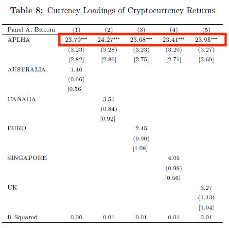 研究中选择澳元、加拿大元、欧元、新加坡元和英镑五种法定货币,评估加密货币价格与法定货币之间的相关性。从表格中发现,投资或基金的绝对回报和按照 β 系数计算的预期风险回报之间的差额,即 Aplha 系数差异不大。加上对瑞波币、以太坊的研究后发现,没有一致的证据表明对于法定货币,加密货币存在系统性的风险敞口。