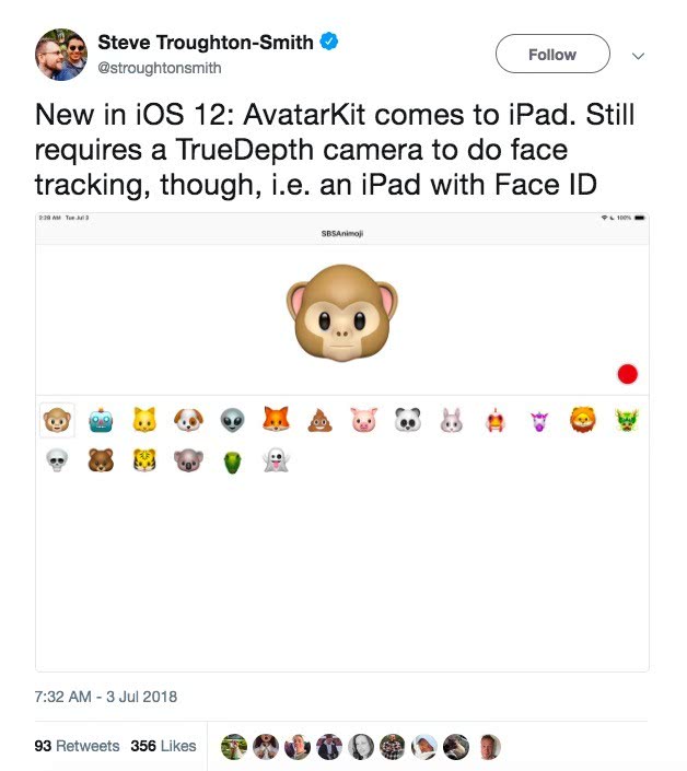 而在今年3月,Twitter用户Steve Troughton-Smith就发现了一款能在iPad上运行的Animoji应用。这就表明,如果新款iPad要支持Animoji的话,那它必须要搭载TrueDepth相机。有了TrueDepth相机,那苹果就很有可能会在iPad上加入Face ID。