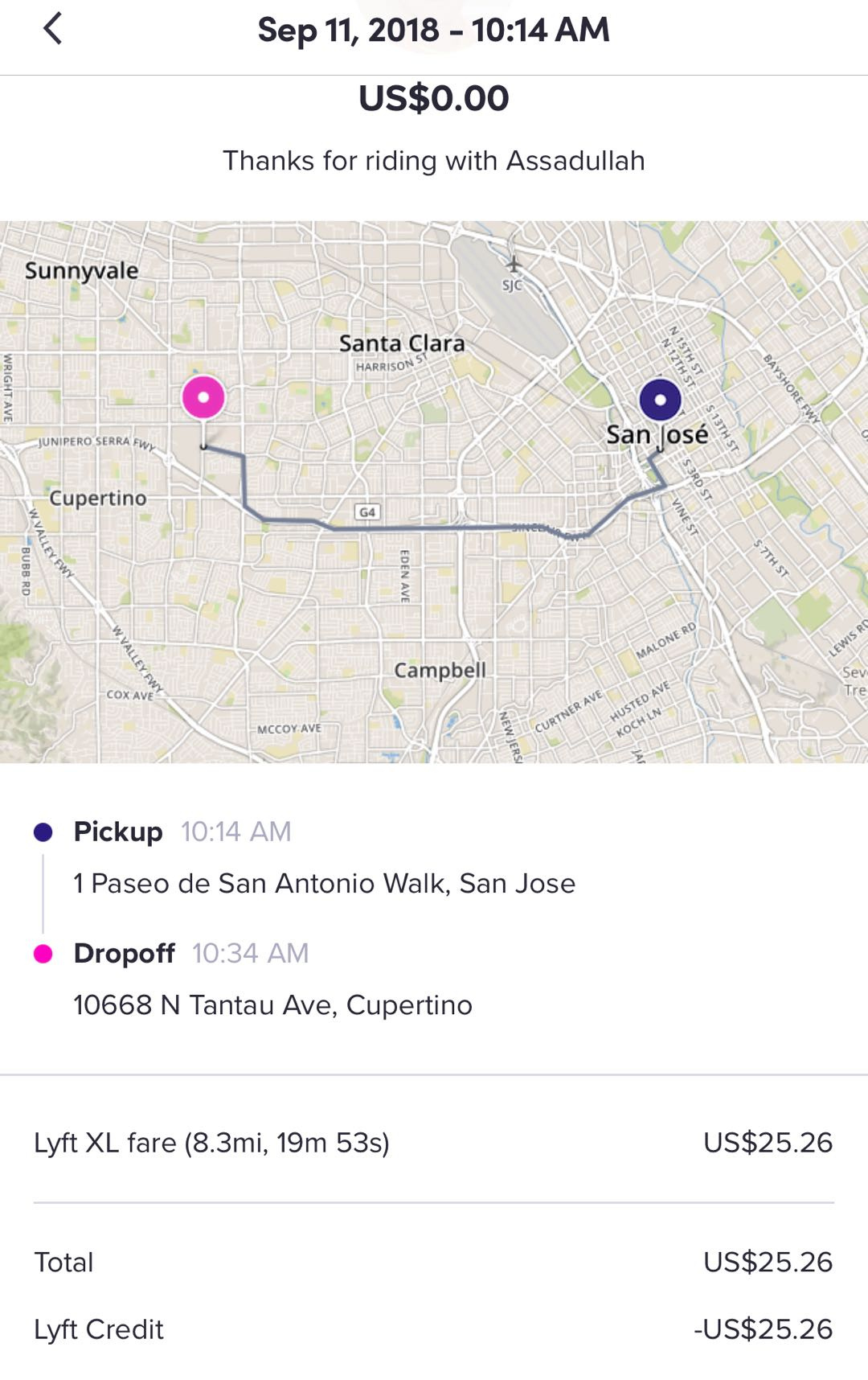 从酒店所在地圣何塞,到苹果新总部Apple Park距离不到10英里,不堵车的情况下,打车15-20分钟,车费也不到30美金。可能是考虑到部分人去新总部一探究竟的需求,苹果选择了和打车软件Lyft合作,只要输入苹果提供的优惠码,在固定区域内打车,单程不超过40美金,一律免费。