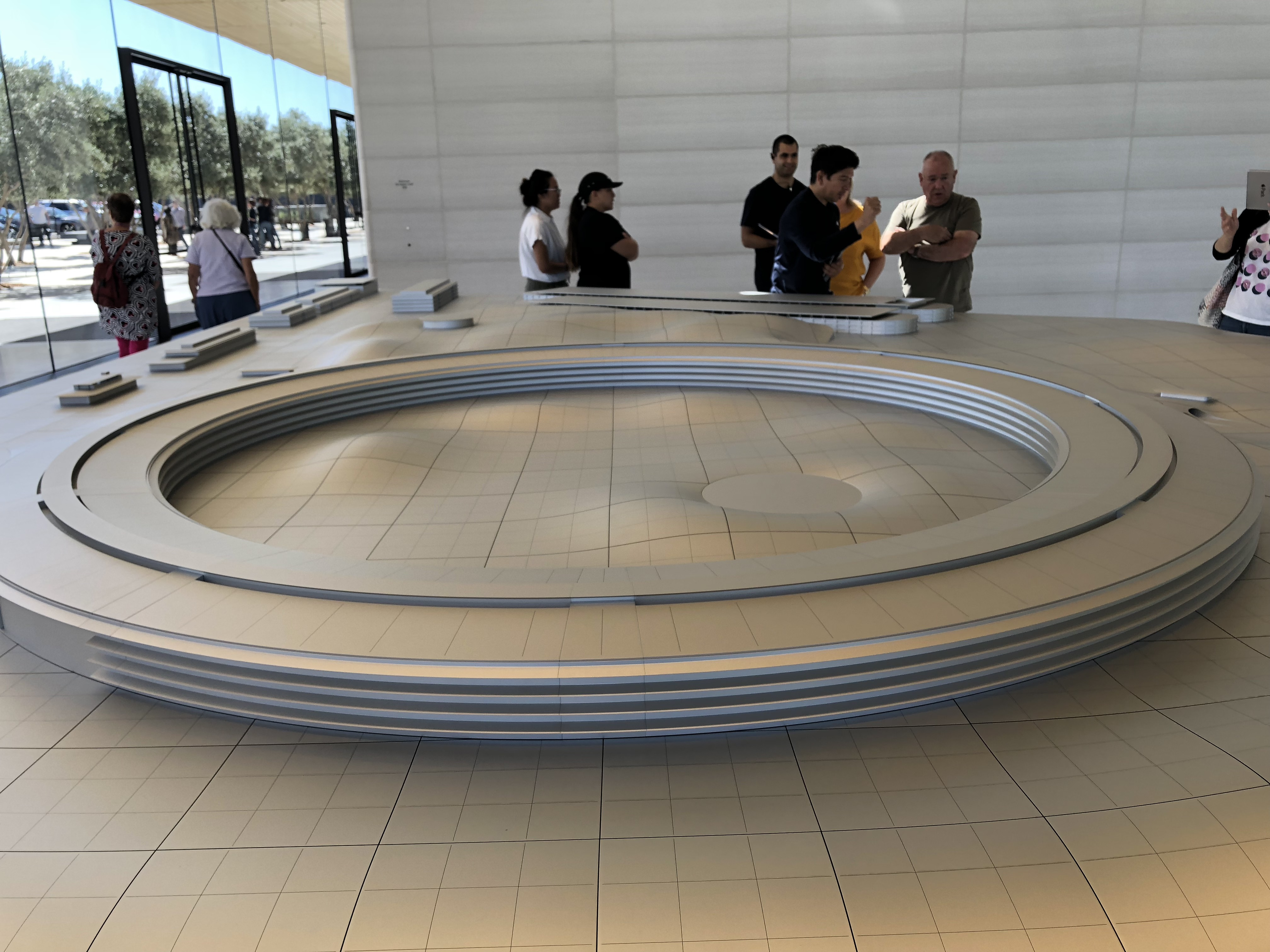 在访客中心里,我们还看到了Apple Park的一个沙盘设计,这个沙盘有意思的地方是用了AR技术,你可以使用iPad很直观的看到Apple Park的内部设计,以及一天之中任何时段呈现的不同景象。