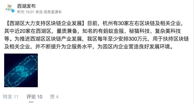 浙江省在区块链技术领域一直较为关注,也有较大力度的财政支持。9 月 11 日杭州市西湖区人民政府官微发布微博称,目前杭州有 30 家左右区块链及相关企业,其中近 20 家在西湖区,例如蚂蚁金服、秘猿科技、复杂美科技等。为推进西湖区区块链产业发展,政府将每年至少安排 300 万元,用于扶持区块链及相关企业。
