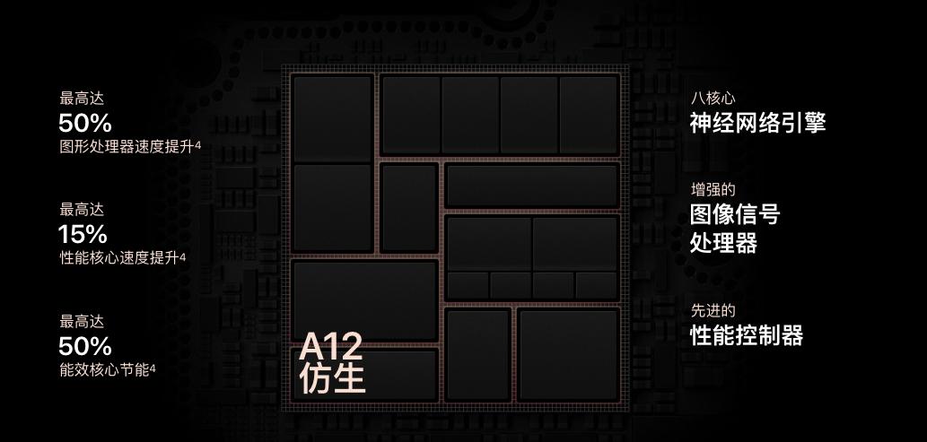 苹果宣称A12芯片是第一个7纳米芯片——华为对此肯定表示抗议,麒麟980才是全球首款7纳米芯片。A12芯片的三个模块CPU、GPU和神经引擎在性能上相对于A11处理器有很大的提升:
