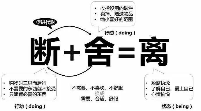 2009年,日本山下英子创作了一本名为《断舍离》的家庭生活类著作。所谓的“断”,即是不买自己不需要的东西;所谓的“舍”,则是处理掉堆放在家里没用的东西;至于说“离”,就是让自己舍弃对物质的迷恋,让自己处于宽敞而舒适的空间。
