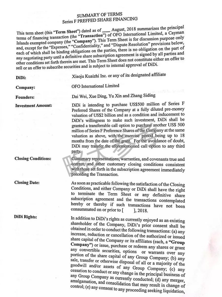 略大参考8日从接近ofo核心人士处获得的一份投资意向书显示,滴滴在8月份曾提出以20亿美金的估值收购ofo,坐实了此前的市场传言。在这份投资意向书中,滴滴提出新董事会将由5名成员组成,其中2名成员由滴滴任命,1名成员由所有创始人共同任命,2名成员由滴滴以外的其他投资者任命。这意味着滴滴要求对收购后的ofo拥有绝对控制权,而ofo的创始人戴威等将被踢出管理团队。