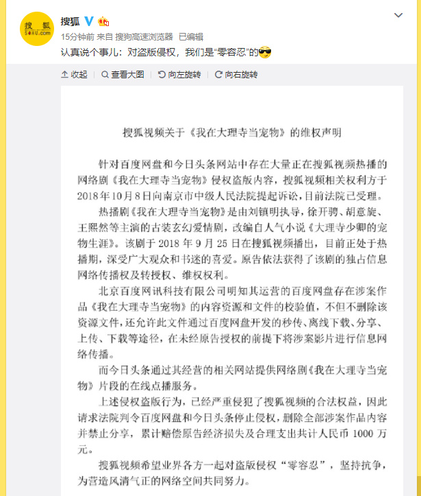 36氪讯,搜狐官方微博今日发布维权声明称,百度网盘和今日头条网站中存在大量搜狐视频网络剧《我在大理寺当宠物》侵权盗版内容,搜狐视频相关权利方于10与8日向南京市中级人民法院提起诉讼,目前法院已受理。