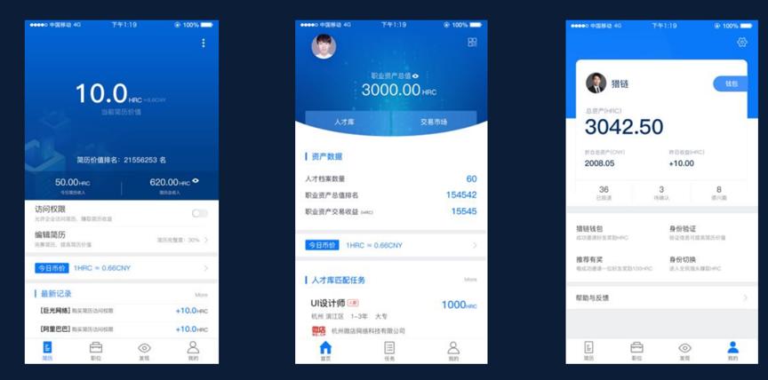 对 C 端用户来说,使用猎链 Dapp 的不同之处在于,除了找工作还可以知道自己的简历在正常求职路径中额外被使用的情况及被使用权限及收益的控制,以及它究竟值多少钱和用户在所在城市的热度及排名,当然求职者本身是求职招聘中重要的一环,以一定的形式参与每一次求职招聘流程将获得对应的 token 奖励。