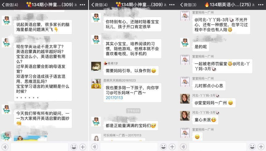 所以在小神童的免费体验社群中,除了每天提供一条内含标准化课程的链接外,其他所有的信息都是逐条发送。我体验之后有两个感受:第一,虽然社群人很多(300 多人),但是频繁的短消息的实时交互性很强,成员参与比较积极;第二,社群在经历了老师每天为每位孩子科普、上课、揪音之后,变成一个感觉上很像微商(无贬义)的社群:宝妈们乐意晒宝宝的学英语视频,而不单单是宝宝的发音音频;宝妈们相互打气坚持学习并且感谢老师。同样在决定付费购买时,用户之间也会有一定的感染力。