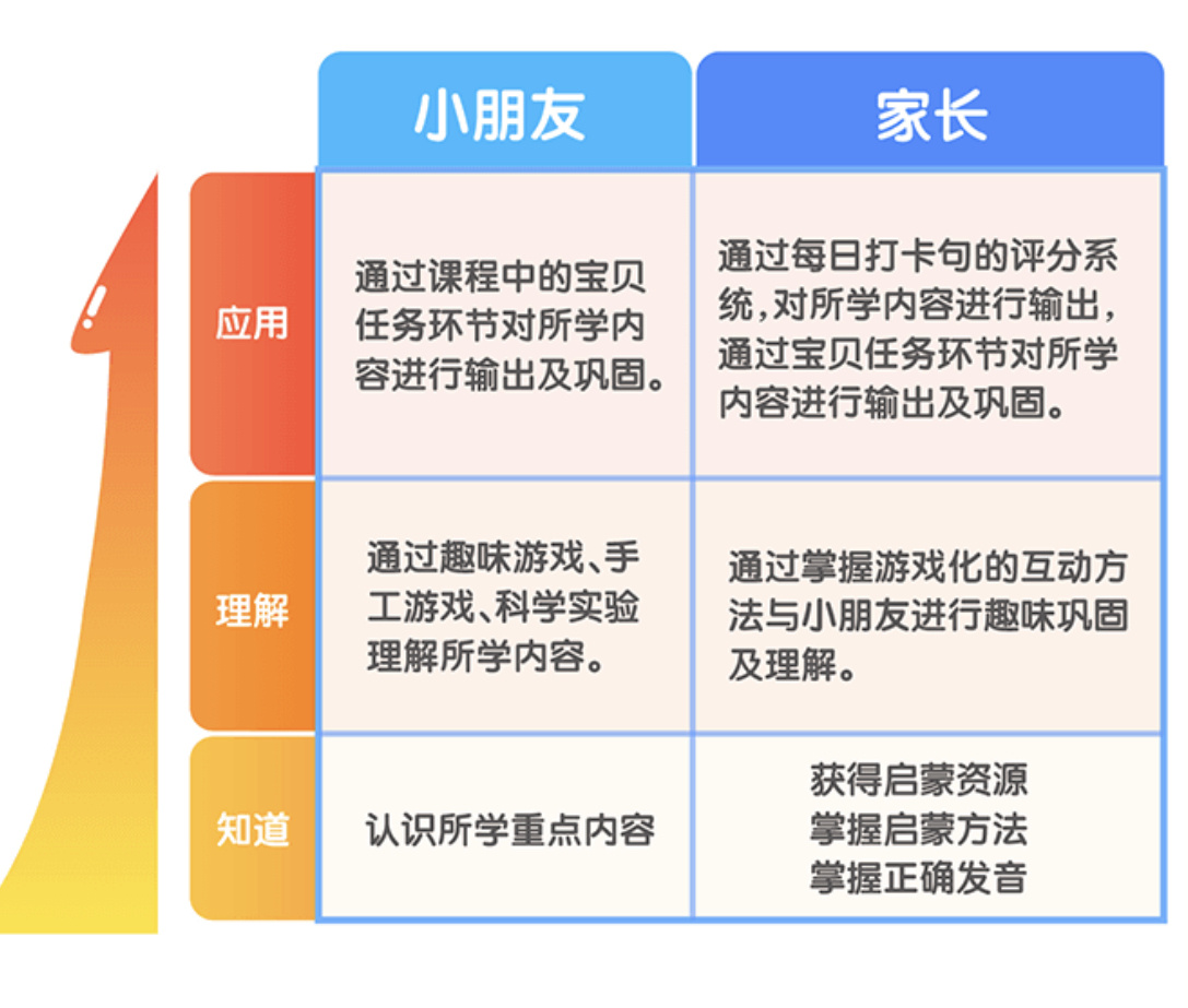 三步教学:三步指教学的三个模块:家长学一学、宝宝玩一玩和一起做任务,用这类模块化的分步教学先教家长、再进行亲子互动、最后通过任务完成从学到用的闭环。三步教学法由图片、文字、声音、视频四种形式构成,避免单一形式带来的审美疲劳。