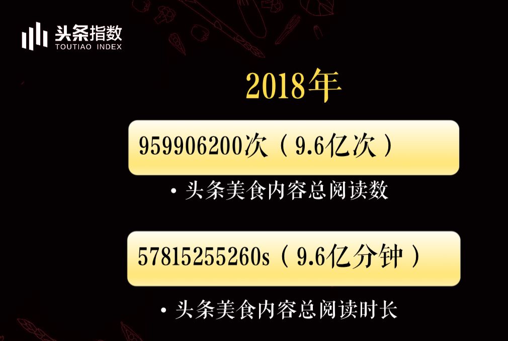 “可能大家没有概念,算了一下,如果(把9.6亿分钟)换算成‘年’,是一万八千年。”今日头条UCC部门本地事业和美食旅游负责人梁春琼说,从2018年1月开始,美食的阅读指数一直处在上升趋势,观看美食内容的女性要多于男性。他们大多处在31岁到50岁之间。
