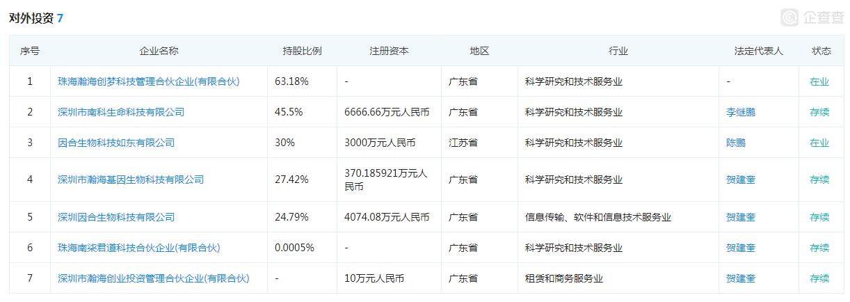 其中最知名的为深圳市瀚海基因生物科技有限公司,贺建奎持有深圳市瀚海基因生物科技有限公司27.42%的持股,该公司注册资本为370.186万元人民币,曾对外宣布研究出世界上最为精准的基因测序仪。