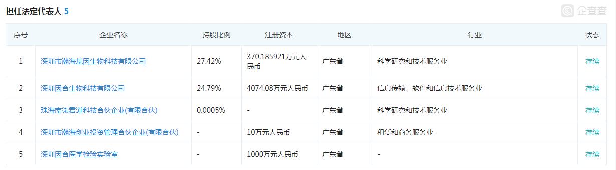 除此之外,贺建奎还是5家公司的法定代表人,分别是深圳市瀚海基因生物科技有限公司、深圳因合生物科技有限公司、珠海南柒君道科技合伙企业(有限合伙)、深圳市瀚海创业投资管理合伙企业(有限合伙)、深圳因合医学检验实验室。