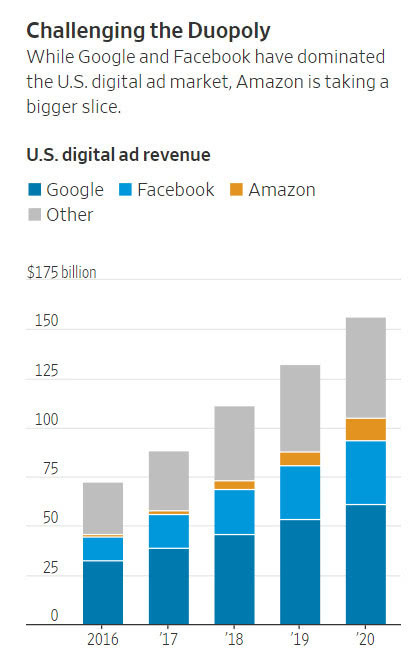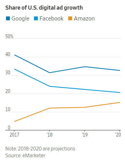 广告主迫切希望出现另一家大牌的数字公司,以帮助提高在线广告市场的竞争力。据eMarketer统计,亚马逊仍远远落后于谷歌和Facebook,这两家科技公司共占美国在线广告支出的61%。