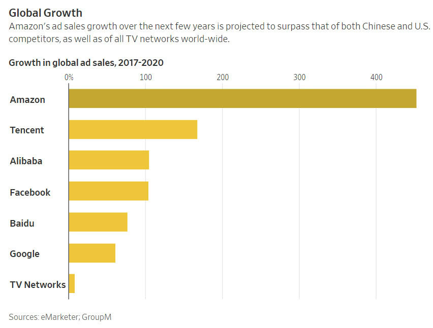 根据eMarketer的数据,亚马逊今年的广告收入将翻一番,达到58.3亿美元。Cowen&Co.的数据显示,未来五年,该公司的广告销售额预计将跃升至284亿美元,从Media Buyer GroupM的数据来看,这将超过全球所有电视网广告收入的总和。