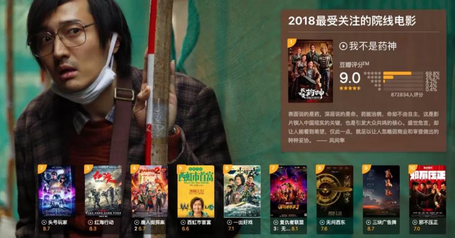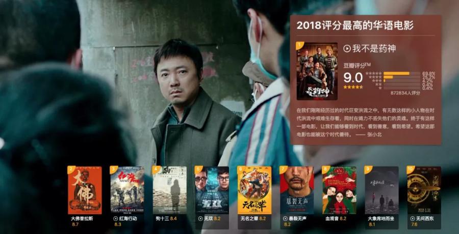 在今年的榜单中,评分最高的华语电影是《我不是药神》,这部讲述「药贩子和白血病人」的电影成了夏天最大的爆款,累计票房超过 30 亿元,跻身中国电影票房排行榜前五位。