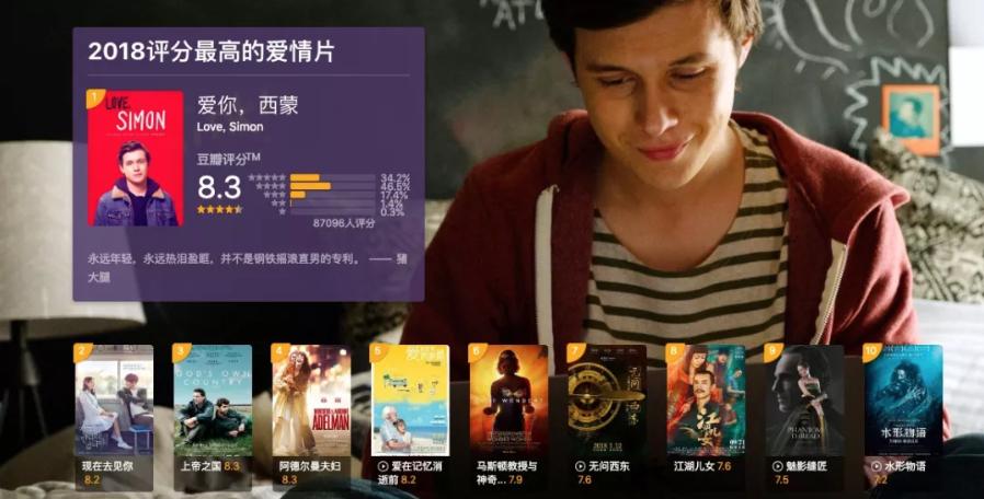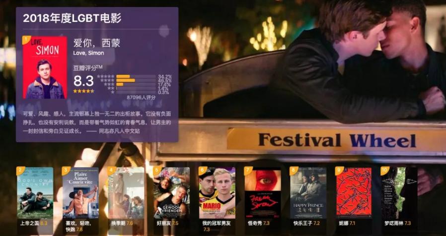 此外依据不同地区和类别也有对应的榜单,值得一提的是,和去年一样,年度爱情电影和 LGBT 电影是同一部,都是《爱你,西蒙》,去年则是《请以你的名字呼唤我》。
