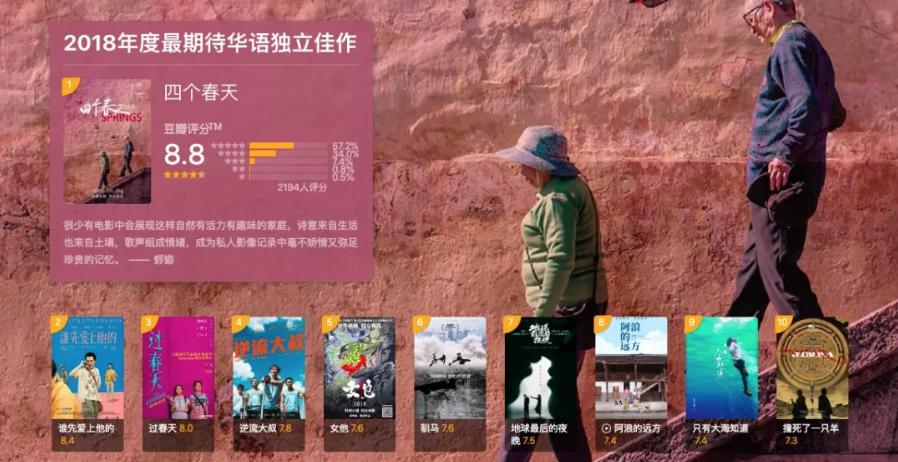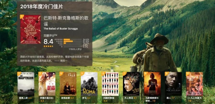 除了主流的院线电影,豆瓣也兼顾了更多小众冷门的电影。《伯德小姐》是今年最受关注的非院线电影,《四个春天》评分人数只有 2194 人,但成为了 2018 年度最期待华语独立佳作。科恩兄弟的新作《巴斯特·斯克鲁格斯的歌谣 》则被评为年度冷门佳片。