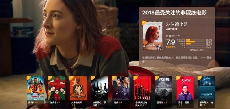 首先来看看豆瓣的 2018 年度电影榜单,评选的维度主要还是豆瓣评分和关注人数,作为国内比较权威和独立的影评网站,观影前先看看豆瓣评分成了很多人的习惯。