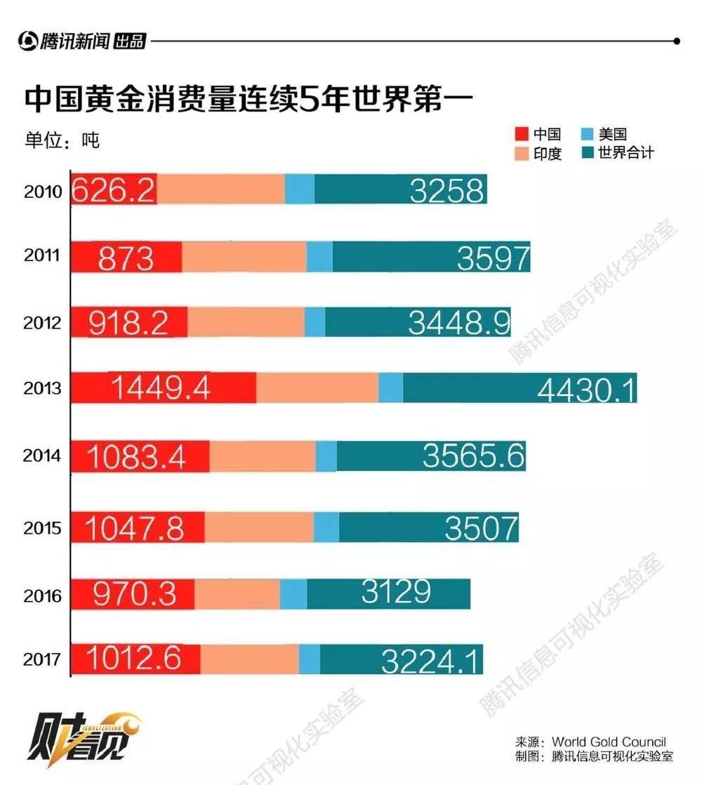 腾讯信息可视化实验室数据显示,过去5年间,中国人每年消费约1000吨黄金,是美国的6倍,总量约占世界黄金消费量的三分之一。