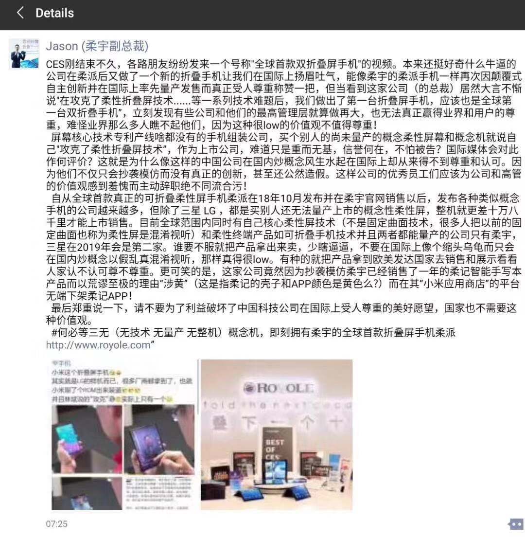 随后,柔宇科技副总裁樊俊超微信朋友圈发布长文开怼小米,说小米高管“公然造假”,价值观有问题,并称“全球首款真正的折叠柔性屏手机柔派在18年10月发布并在柔宇官网销售以后,发布各种类似概念手机的公司越来越多,但除了三星LG,都是买别人还无法量产上市的概念性柔性屏,整机就更差十万八千里才能上市销售。”