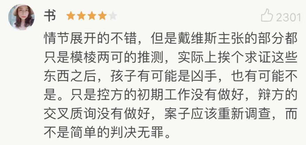 我猜,很多人期望故事延伸到找出凶手这一步,而不是“简单的判决无罪”,这个愿望其实颇有道理,因为看起来无辜的孩子也有可能确实是罪犯,1996年的《一级恐惧》就反用了这个梗,但如果故事是这个走向,那么大概率就成了本格推理,外加包青天式的洗冤,任何称职的编剧都能做好。