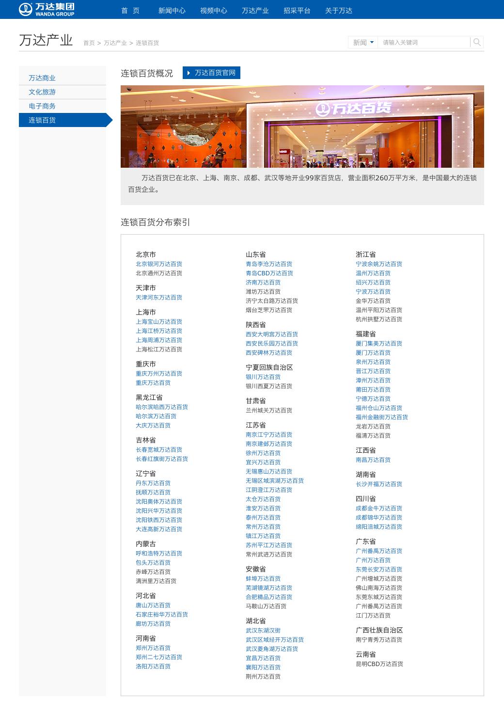 直到如今,我们依旧能从这样一个网页上窥见万达百货曾经的辉煌:上面罗列了万达百货遍布北京、上海、南京、成都、武汉等地的99家百货门店,规模达到“营业面积260万平方米”。尽管点进的每个链接,都是“无法显示”。
