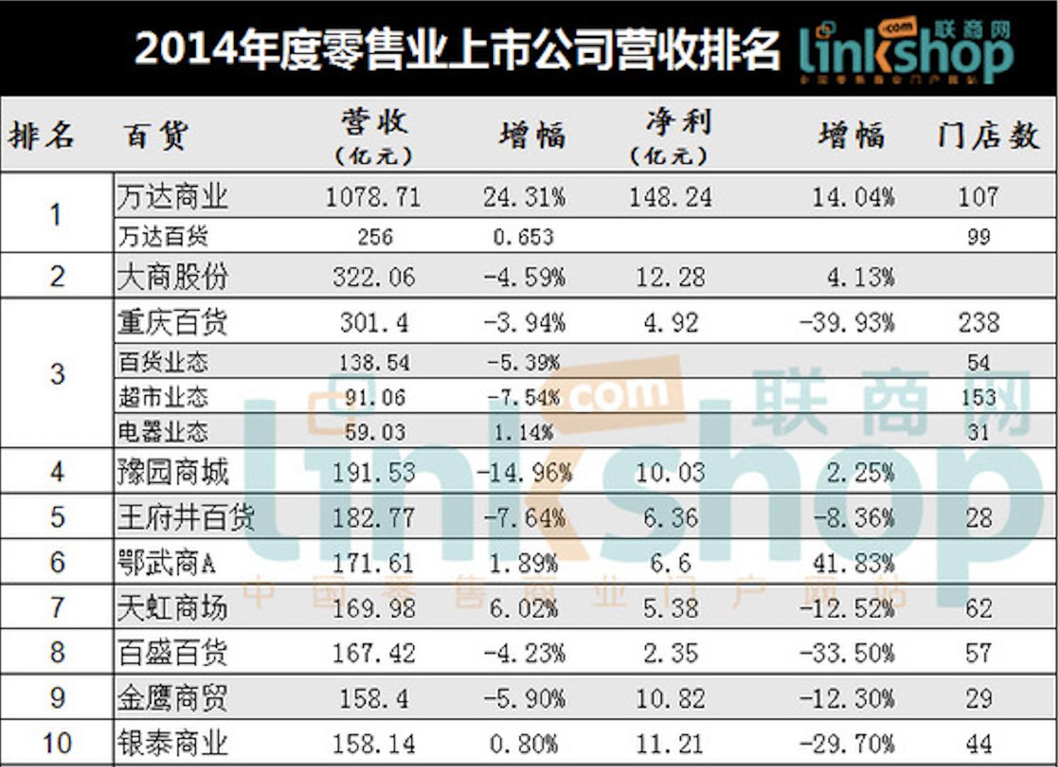 盛名之下,衰势早已显现。2013年,万达百货净利增亏7%,收入只完成计划的91%,成为那一年万达集团旗下唯一未完成指标的公司。被“点名批评”的万达百货在2014年拼尽全力,实现收入256亿元,同比增长65.3%,赢得了王健林的高度表扬。