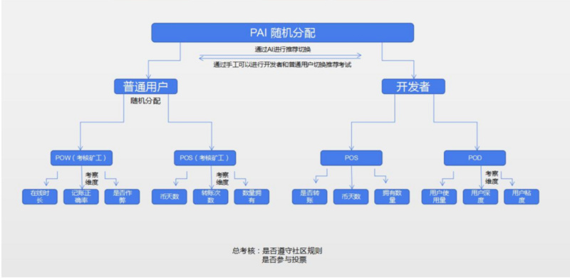 POW 阶段将是所有矿工的考核期,只有通过该阶段的考核才可以过渡至 POS 阶段。在 POW 该阶段中,MAI 将通过 AI 模型检验各个矿工持有算力占总算力的数量,记账情况以及矿工的在线时长等,以判断矿工的可信度和诚实度。