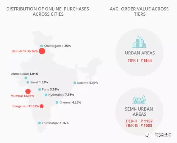 以新兴市场印度为例,新德里,孟买,班加罗尔和海得拉巴四个主要大城市贡献了超过70%以上的电商销售额。且具有更高的客单价50%+。
