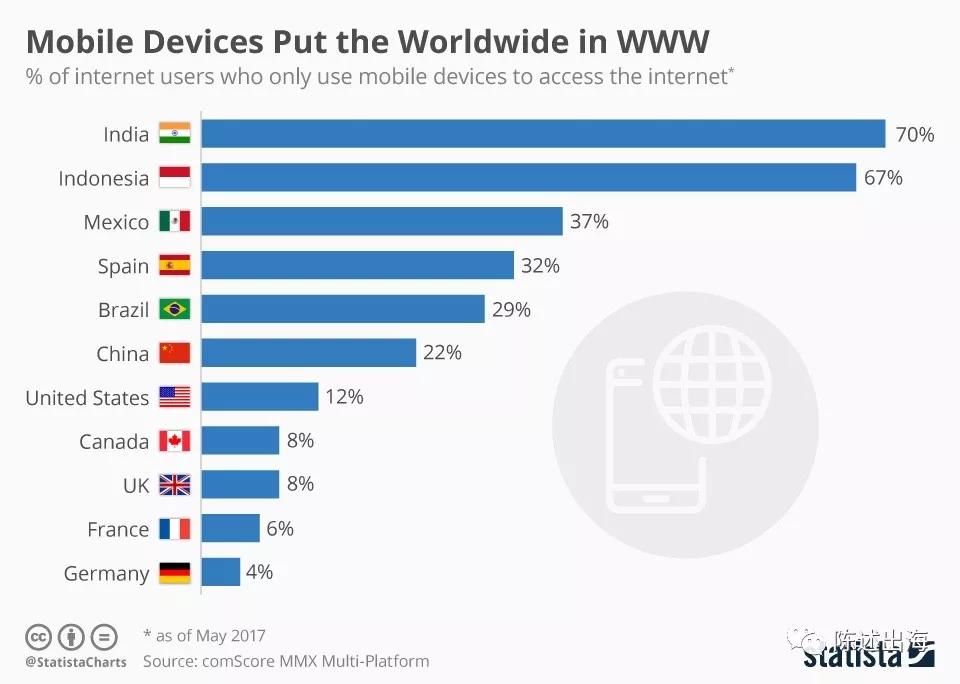 从全球移动互联网接入网络比例统计可以看出,新兴市场,印度,印尼,墨西哥,巴西等国,移动设备都是最主要的网络接入方式。