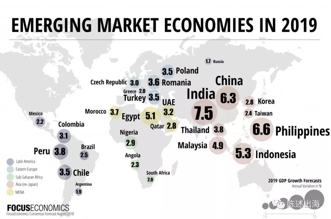 根据 FocusEconomics 的预估,新兴经济体中,南亚的印度,东南亚的菲律宾,印度尼西亚,马来西亚,泰国,中东的埃及,土耳其,阿联酋,卡塔尔,摩洛哥;东欧的波兰,罗马尼亚;南美的哥伦比亚,秘鲁,智利等国2019年的经济增长率都有望超过3%以上。从经济增长率也可以初略看出,出海电商东南亚是和中东是第一第二大潜力市场。紧接着东欧,南美部分国家,也有不错的潜力。