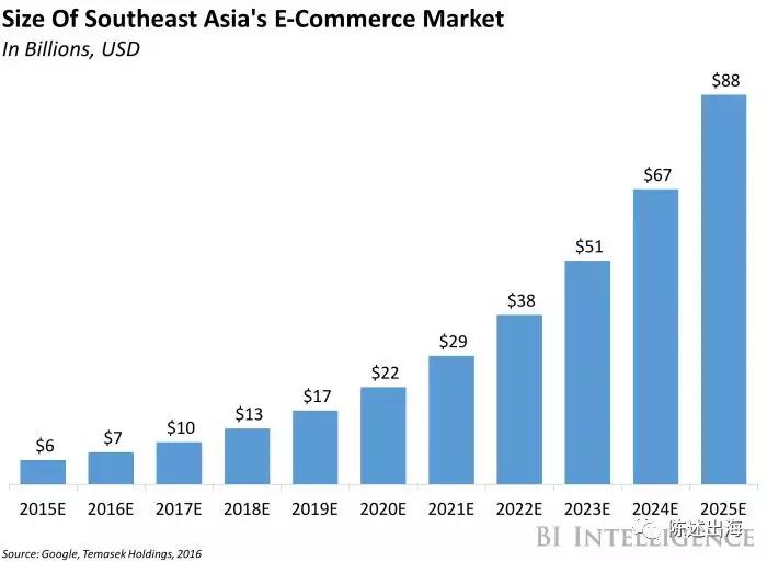 得益于这些新兴经济体快速的经济增长,当地民众消费能力的改善和提升,跨境电商市场也迎来了快速的增长。根据 Google 和 Temasek 的估计,东南亚跨境电商增长迅猛,预计2019年将达到170亿美元的市场规模。