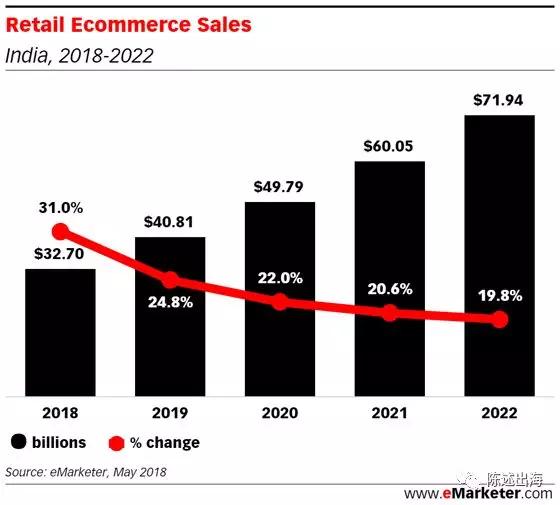 根据 eMarketer 的估计,临近东南亚的印度,跨境电商预计也将在2019年达到400亿美元的市场规模,并持续保持20%以上的增长率。