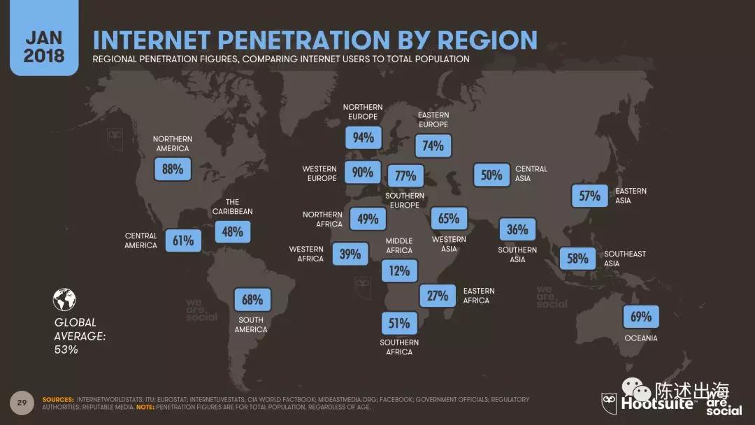主要的新兴市场地区的互联网渗透率,如东南亚:58%,中东65%,东欧74%,中南美洲61%-68%等在2018年1月都超过了世界平均水平53%。