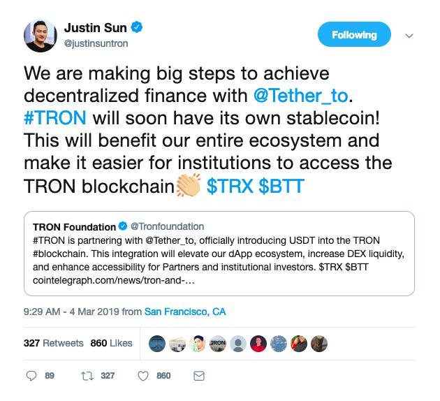 3 月 5 日,美元挂钩的稳定币( USDT )的发行方 Tether 宣布,与波场基金会达成合作,预计将在今年第二季度波场区块链上推出符合 TRC-20 技术标准的 USDT。