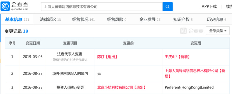 36氪讯,企查查数据显示,2019年3月5日,上海大黄蜂网络信息技术有限公司法定代表人由陈汀变更为王庆山。此前,2月20日,程维卸任快的公司法定代表人及总经理,由王庆山接任。