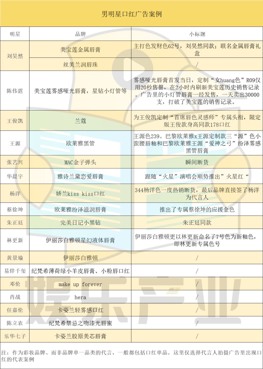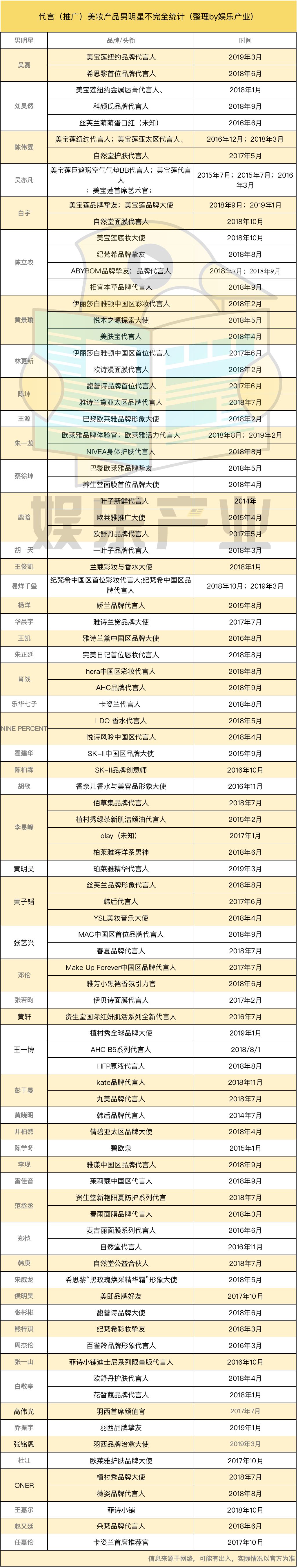 今年,目前已经官宣的品牌有6个,包括美宝莲、珀莱雅、植村秀、羽西、欧莱雅、纪梵希,合作艺人分别对应吴磊/白宇、黄明昊、王一博、乔振宇/张铭恩、朱一龙、易烊千玺。可以预知的是,这一数字还将继续大幅增加。