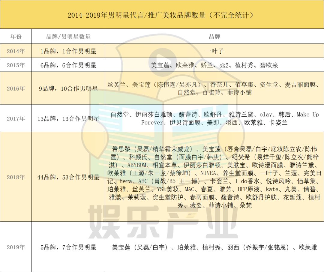到了2015年男明星代言的女性美妆品牌数量开始增加到6个,其中吴亦凡成了美宝莲巨遮瑕空气气垫BB代言人,霍建华牵手SK2为中国区品牌大使。然后逐年增多,2016年有9个美妆品牌合作了10位男明星,像美宝莲同时签下陈伟霆和吴亦凡两位当红艺人;2017年品牌数量变成13个,到了2018年数字激增到44个品牌,53个合作男明星。
