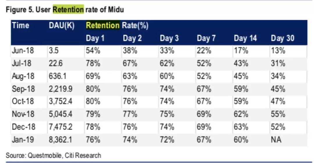 根据花期银行的研报,到了2019年1月,米读的日活跃用户数已经到了840万,每日活用户平均单日花费时间为556.95分钟,相比2018年6月日活用户数为3500人,每日活用户平均单日花费时间为为61.96分钟,根据猎豹移动的数据,存留率从2018年6月的13%攀升到了2018年12月的50%。