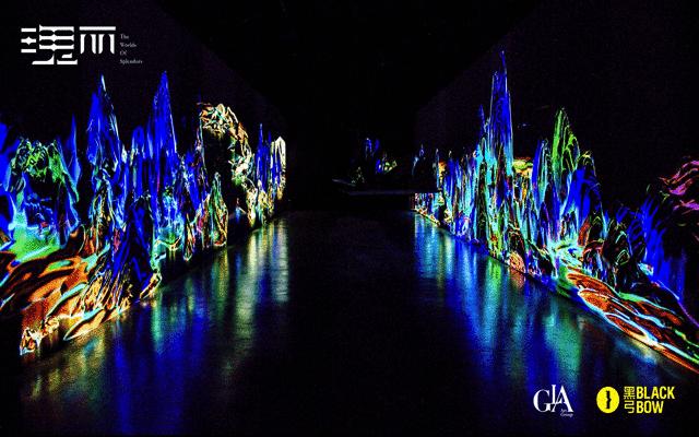该场景共有黑白、青绿和浮雕 3 种模式,其中穿插着水波纹、光线粒子和星云漂移等特效场景。左右墙幕及地面的 36 个山体模型之间,设置了“定点互动”和“自由互动”触发效果,轻轻触碰会出现放散射光粒子、光束的动态效果,且多组画面之间的过渡流畅自然。据团队介绍他们实时采集、渲染输出的图像为全 4K 画质。