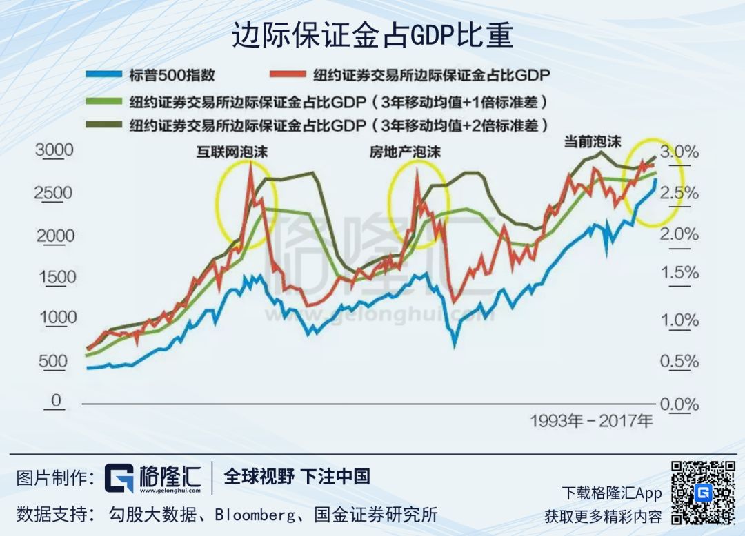 在互联网泡沫和房地产泡沫时期,保证金债务的峰值约为GDP的2.75%。在目前的股市泡沫中,边际保证金债务接近GDP的3%。
