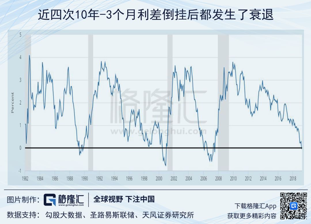 长端利率反映经济预期,短端反映资金利率,利差倒挂一方面是短端加息冲击,另一方面是长期增长预期低迷。倒挂意味着衰退,近四次10年-3个月利差倒挂后都发生了衰退。