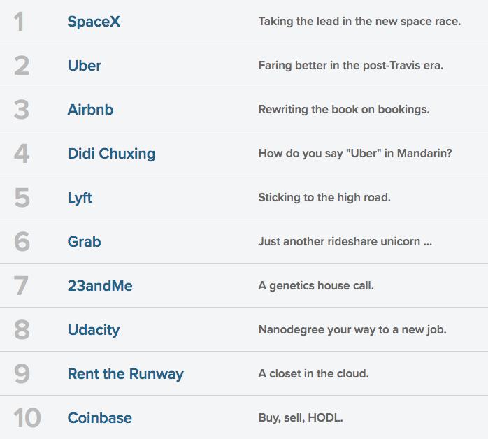 这种现象在 2018 年要更浓烈一些:去年的榜单前十名里,有 4 家都是共享出行平台。而去年上榜公司中还有一股明显的加密货币热,今年都消失了。